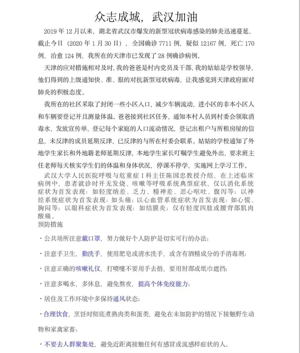 发表时间:2020-02-05 隔离的是病毒,凝聚的是同心!感谢奋战在前线的每一位医生,感谢现在还坚守在自己岗位的每一个人。嘉华财务与金融学院全体师生响应号召:国有需我必献,克时艰我必战!