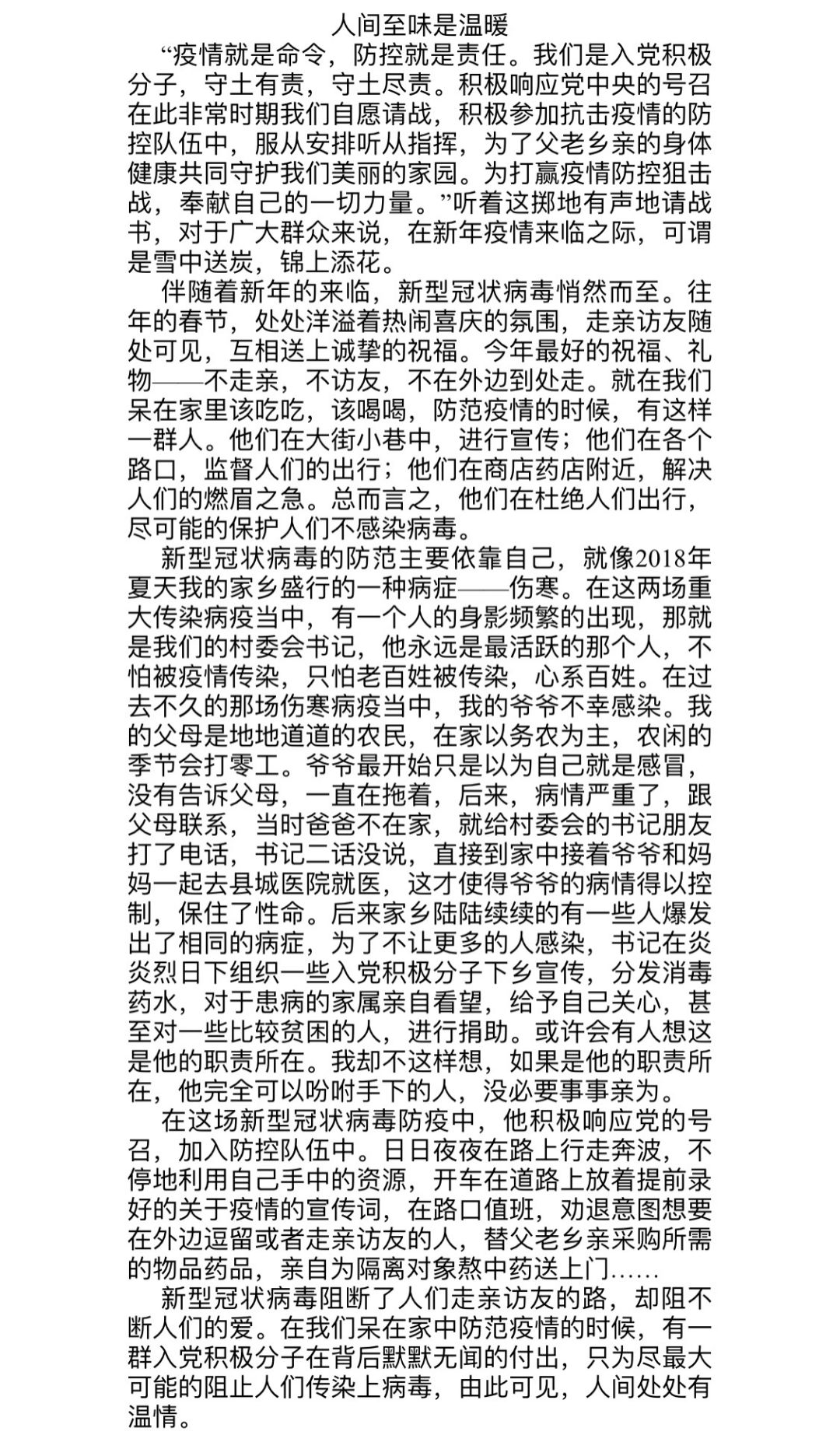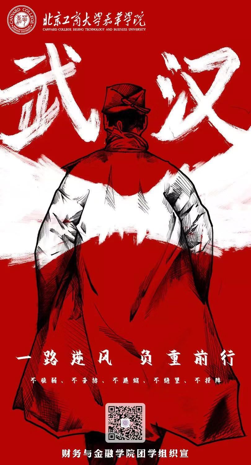 --财务与金融学院全体师生 生命重于泰山,疫情就是命令,防控就是责任!自这场战“疫”行动打响以来,我院师生坚决贯彻落实党中央、国务院以及校党委关于疫情防控的指示精神,有方法、有步骤地向全校师生开展防控及宣传工作,发起了“北京工商大学嘉华学院 众志成城——大学生战疫在行动之系列活动”。 01 “众志成城、共克时艰” 宣传征文活动 我校财务与金融学院第一党支部作为全国党支部工作样板支部,义不容辞扛起本校防疫工作的大旗,于2020年1月30日19时发起“众志成城、共克时艰”宣传征文活动。征文内容为科学的防疫防毒知识、家乡防疫措施及现状、记述在非常时期的非常故事、加强自我管理、提升自我保护意识等,该活动的开展旨在加强大学生防疫意识,记录各地防疫故事,宣扬全国各族人民在我党的强力指导下的抗疫典型。 金融191 李欣怡 《众志成城 武汉加油》 02 “书香涵泳,润泽心灵” 读书月活动 “要成为像钟教授那样对祖国有贡献的人。妙手回春,救民于水火;悬壶济世,护国于危难。成为钟南山那样的人,是读书的终极目的。” 疫情面前,听钟南山院士告诫,向钟南山教授学习,用知识战胜疫情已成为当下大学生刻不容缓地任务。为此,北京工商大学嘉华学院第一党支部组织开展了“书香涵泳,润泽心灵”读书月活动,旨在激发学生的读书热情,营造浓郁的读书氛围,推进大学生素质教育。 此次的网上读书交流对嘉华学子来说是一种崭新的体会,自“书香涵泳,润泽心灵”读书月活动开展以来,众多同学踊跃参加,反响热烈。同学们认真阅读书籍,仔细做好笔记,真实展现了嘉华学子在寒假“不忘初心”,积极读书,在全国疫情之时,仍然保持积极的心态,沉稳的状态,沉浸在书籍的海洋。 会计193 申怡娟 《我们仨读书笔记》 03 第二届“OFFICE” 达人秀办公软件大赛 为有效阻断疫情在校园蔓延,我校坚决贯彻落实国家及北京市教委关于延期开学的指导意见,延迟开学。但是,延迟开学不是停止教学,为积极响应学校“停课不停学”的号召,财务与金融学院团学组织开展“众志成城 大学生战役在行动之办公软件大赛”,旨在培养学生基本办公软件应用能力,适应当今职场需求的同时,达到督促学生在家学习和控制此次疫情的目的,并为后续教学部门开展的线上教育教学模式奠定基础。 自活动发起以来,学生们积极响应,参与热情高涨,大部分学生报名参加活动。有了广大学生的支持与参与,我们一定能够在保障防控疫情的前提下,吸收优质教学资源,圆满完成学习任务。 04 “以服务炼党心,忆往昔诉初心” 优秀模范故事征集活动 “这是一场没有硝烟的战斗,他们选择逆风而上,冲锋在前;对待疫情,他们选择逆风而行,坚守岗位。在疫情防控面前,没有局外人、没有旁观者,每一名党员干部都是战斗员,是急先锋。” ——致敬我们身边最“可爱”的党员同志 自疫情防控系列活动开展以来,财务与金融学院团学组织发起“以服务炼党心,忆往昔诉初心”的优秀模范故事征集活动。活动本着征集党员同志们在疫情防控中亲身经历的优秀事迹,或身边党员同志过去奋斗的优秀事迹为原则,旨在弘扬优秀模范们的奉献精神,激发新时代青年学生的奋斗激情,在疫情肆虐的非常时期,以开拓进取、无私奉献的精神面貌为社会贡献自己的一份力量。 财管181 温晴 《人间至味是温暖》 嘉华学院优秀学子温晴的家乡村委会书记只是在收到的众多模范故事来稿中,涌现出的有责任、敢担当、善作为的基层一线党员干部中的一员,在我们身边,还有许多像他们一样的党员同志们义无反顾奔赴战场,留下一个个最美逆行的背影。在当前疫情防控工作中,他们夜以继日,始终坚持发扬党员先锋模范作用,用自己实际行动践行入党时的铮铮誓言。向党员同志们学习,行动起来,坚决打赢这场疫情防控狙击战。 05 “中国加油、武汉加油、共抗病毒” 海报评比活动 在这个非常战“疫”时刻,财务与金融学院第一党支部发起“中国加油、武汉加油、共抗病毒”为主题的抗击疫情艺术行动征集令。旨在用画笔增强学生的团结力、凝聚力和创造力,加强对此次新型冠状病毒的认识,提高自我防范意识,牢记“不传谣、不信谣、在家为国做贡献”的使命。 海报征集信息发布四天,就已收到学生作品百余幅,涵盖了手抄报、电子海报、手绘海报等多种艺术形式,相关微信推文的点击量已达两千。众多作品不仅紧扣主题,富有吸引力,更是图文并茂,色彩搭配协调,给观众强烈的视觉冲击,在希望借助海报给武汉加油鼓励的同时,也能向全校师生传播抗击疫情的科普常识,最大程度上发挥了海报能鼓舞人心和传播有效信息的功能。 金融国际191 申诗琪 《三山联手 武汉加油》 金实162 牛雨莹 《武汉加油》 会计182 董天歌 《致敬逆行》 我们的战斗还在继续, 嘉华学子抗“疫”活动会持续开展下去, 我们坚信: 灾难面前, 全体嘉华人用实际行动共同迎战, 身在四方,心在一起, 战疫至胜利,加油同接力! 待春暖花开冰雪融化, 武汉,我们繁花与共可好?